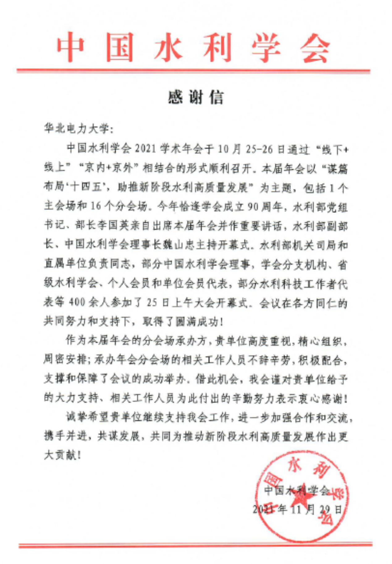 水资源分会征集会议论文45篇,受到了专家一致好评。11月29日,中国水利学会致信学校,对学校精心组织,周密安排会议表示感谢,表示学校相关单位不辞辛劳,积极配合,支撑和保障了会议的成功举办。