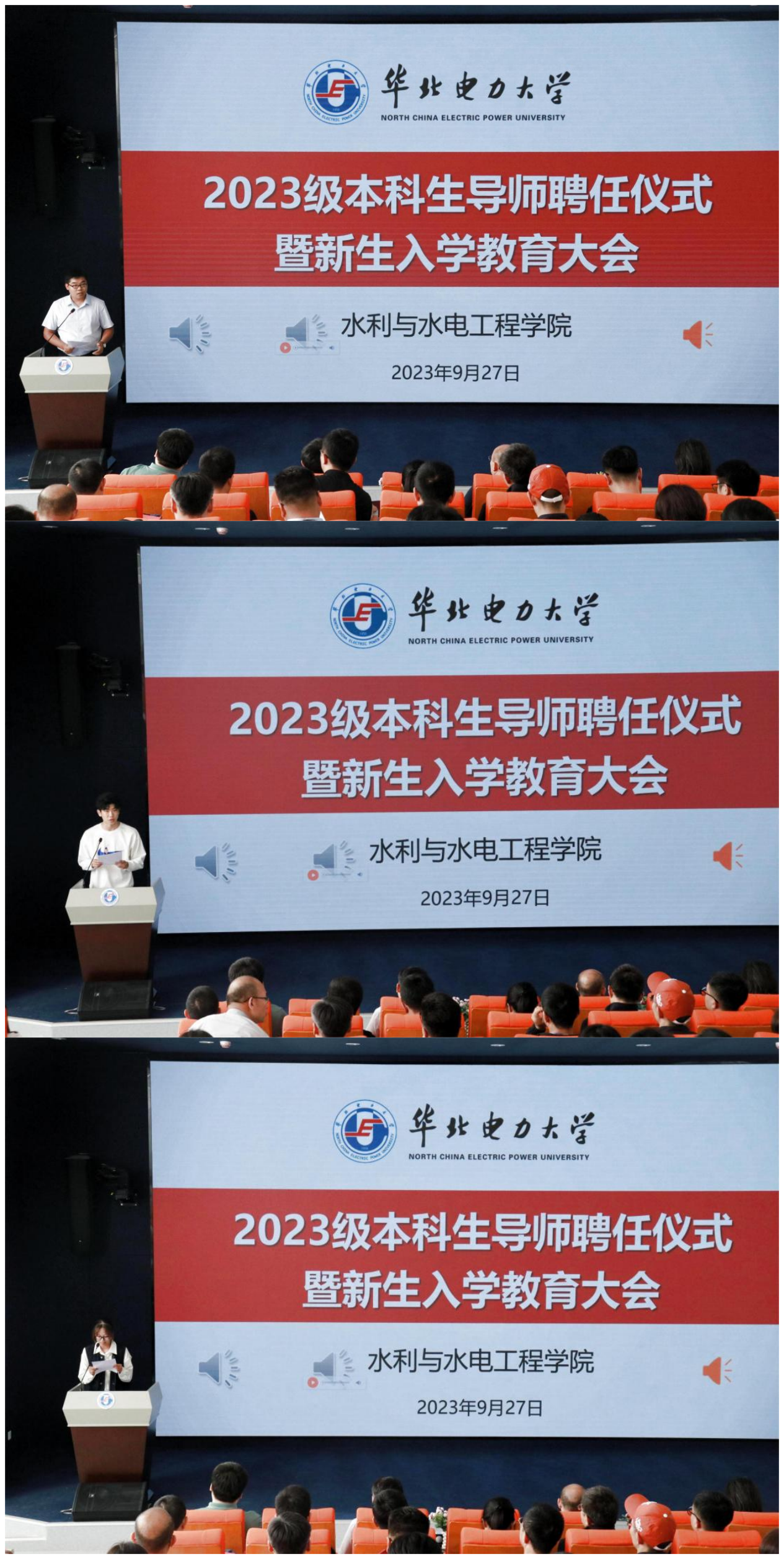9月27日下午,水利与水电工程学院在教一14阶梯教室举办了2023级本科生导师聘任仪式暨新生入学教育大会。学院全体院领导出席大会,2023级本科生导师、班主任和全体2023级本科新生参加会议,会议由学院党委副书记杜广微主持。
