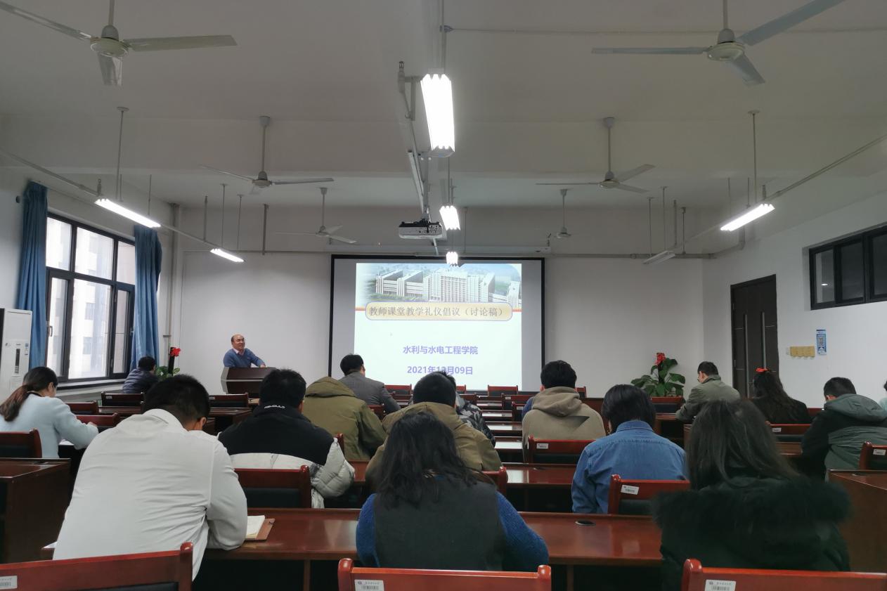 12月9日,水利与水电工程学院教职工学习《坚持把教师队伍建设作为基础工作》暨教师课堂教学礼仪倡议讨论,学院党委副书记杜广微、副院长王弋、全体教职工参与学习讨论,会议由党委书记刘明军主持。