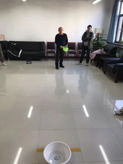 本次活动方式为投掷人员站在投掷线后,向四米外的目标物(洗脸盆)投掷乒乓球,可以直接投向目标物,也可以投向地面经多次弹跳奔向目标物,每人十个球,以最后留在目标物内的乒乓球数作为最终成绩。