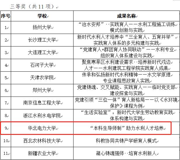 近日,水利与水电工程学院的德育工作案例《“本科生导师制”助力水利人才培养》在第三届全国水利德育教育优秀成果遴选中获得三等奖。该评选由中国水利教育协会主办,共有包括清华大学、天津大学在内的51所院校的80项成果申报,经汇总初审、线上评审、专家评议及公示等程序,最终遴选出水利德育教育优秀成果(本科组)一等奖4项,二等奖7项,三等奖11项。