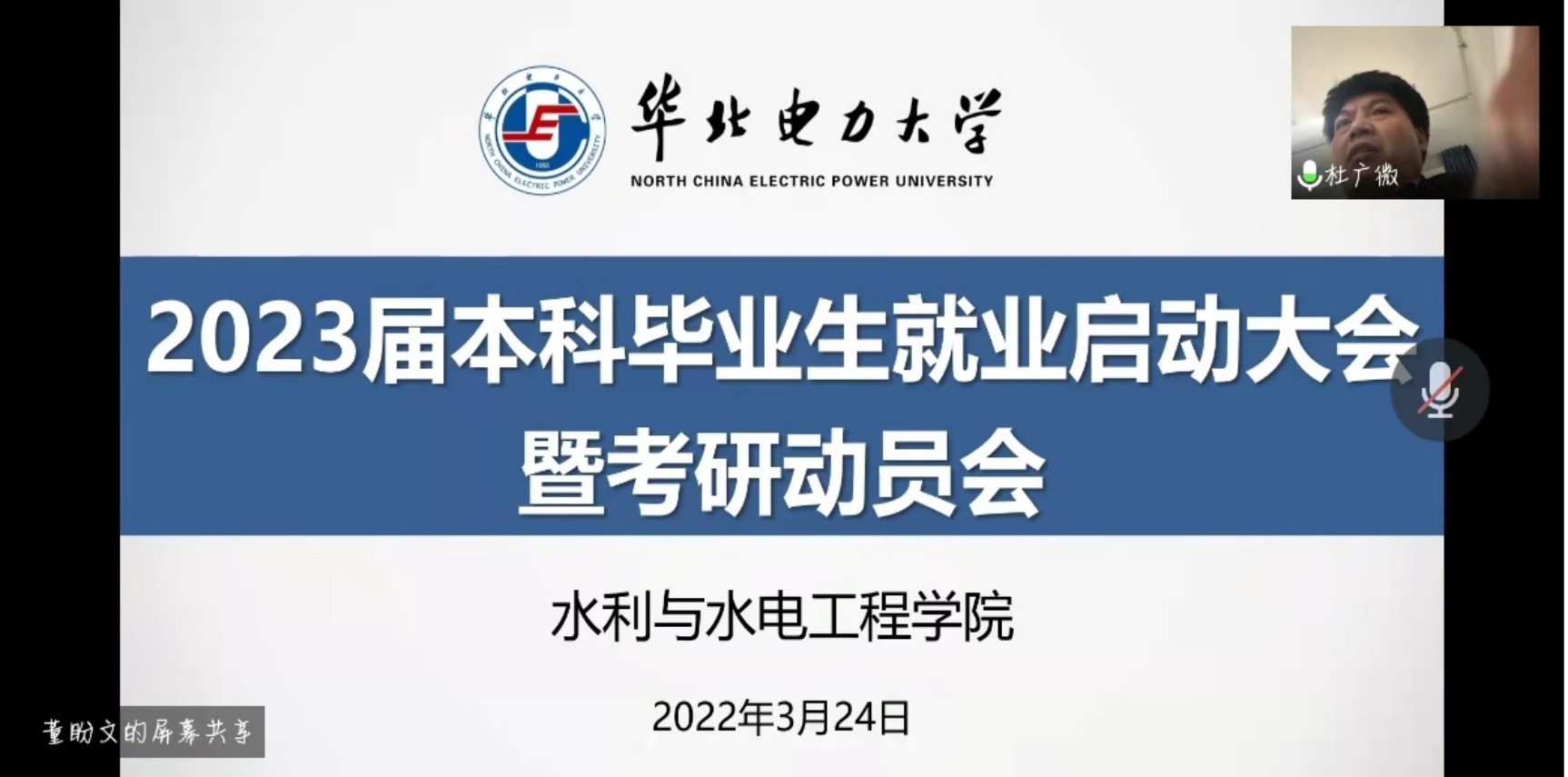 3月24日中午,水利与水电工程学院线上召开了2023届本科毕业生就业启动大会暨考研动员会,学院副院长(主持工作)张尚弘、党委副书记杜广微出席大会,学院2023届本科毕业生参加会议,会议由学院团委书记宋辉斐主持。